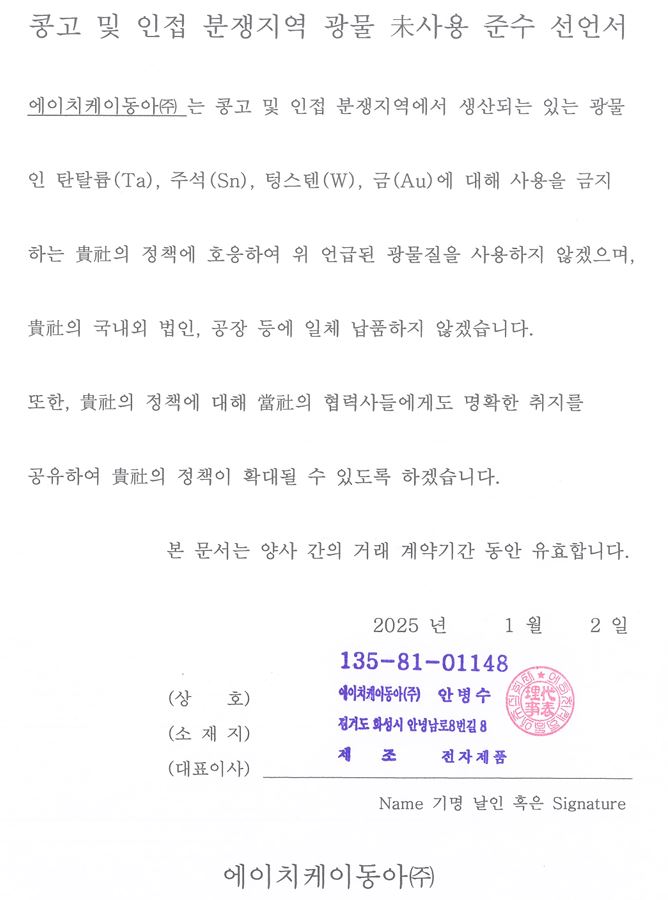 콩고 및 인접 분쟁지역 광물 未사용 준수 선언서